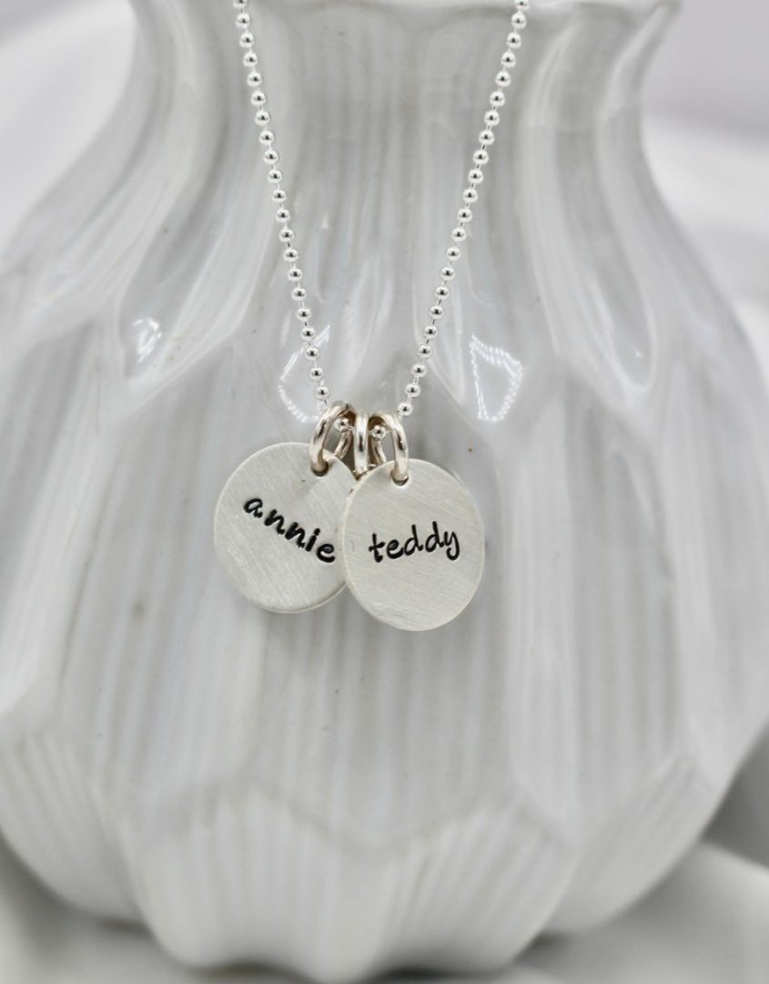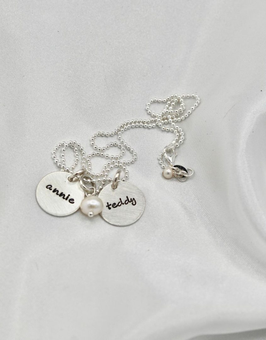 Small sterling silver circles (5/8″) are handstamped with your choice of names or words. Pick your font below, lowercase calligraphy is shown in main picture. Hung on a sterling silver ball chain with a freshwater pearl.