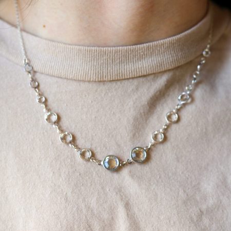 Our favorite place for a disc necklace to lay is just below the collar bone, halfway down the neckline, and below the neckline.