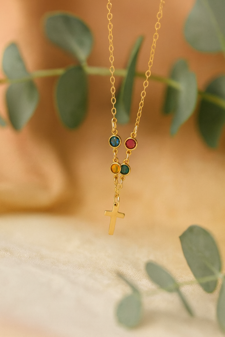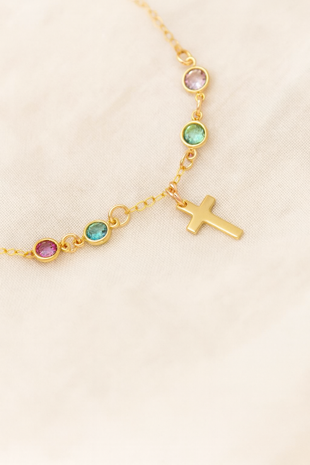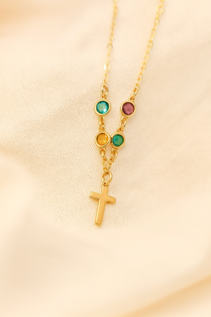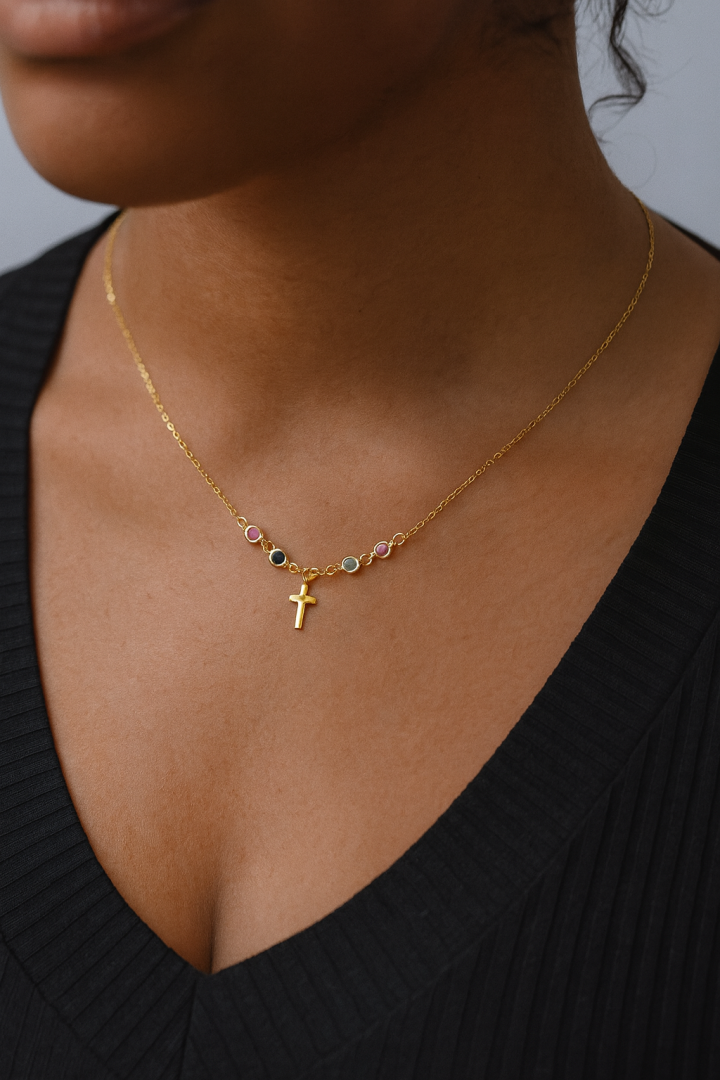Graceful and timeless, the Radiant Faith Birthstone Necklace in gold-filled beautifully blends faith and personal meaning. A dainty gold cross charm is paired with shimmering birthstones—each one representing a loved one or a special moment close to your heart. The charms are delicately linked and suspended from a fine gold-filled chain, creating a warm, elegant glow that complements any style.