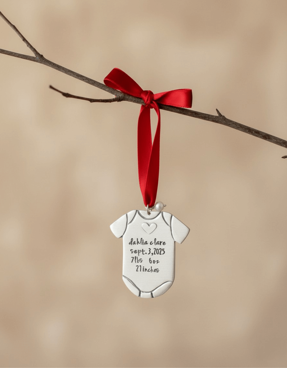 Celebrate a sweet new arrival with our Little Blessings Onesie Ornament, a timeless keepsake crafted in fine pewter. Shaped like a baby onesie, this handcrafted ornament can be custom-stamped with the baby’s name, birthdate, weight, and length, or any text you would like. Making it a meaningful gift for new parents or grandparents. A classic red velvet ribbon adds a festive touch, and an optional heart can be included for a baby girl. Whether hung on the Christmas tree or displayed year-round, this piece is a beautiful way to remember the day your little blessing was born.