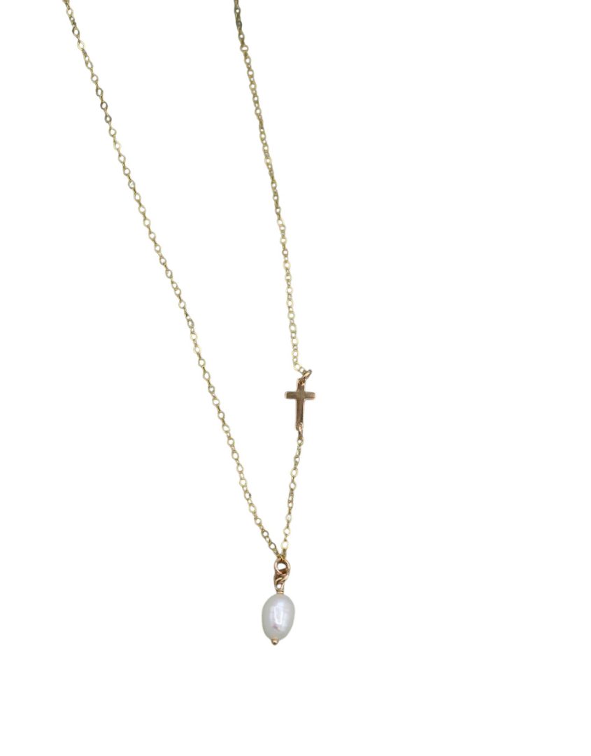 Handcrafted in your choice of sterling silver or yellow gold-filled, this elegant design features a luminous freshwater baroque pearl, symbolizing purity and devotion, paired with a delicate cross, representing the priceless treasure found in Christ.