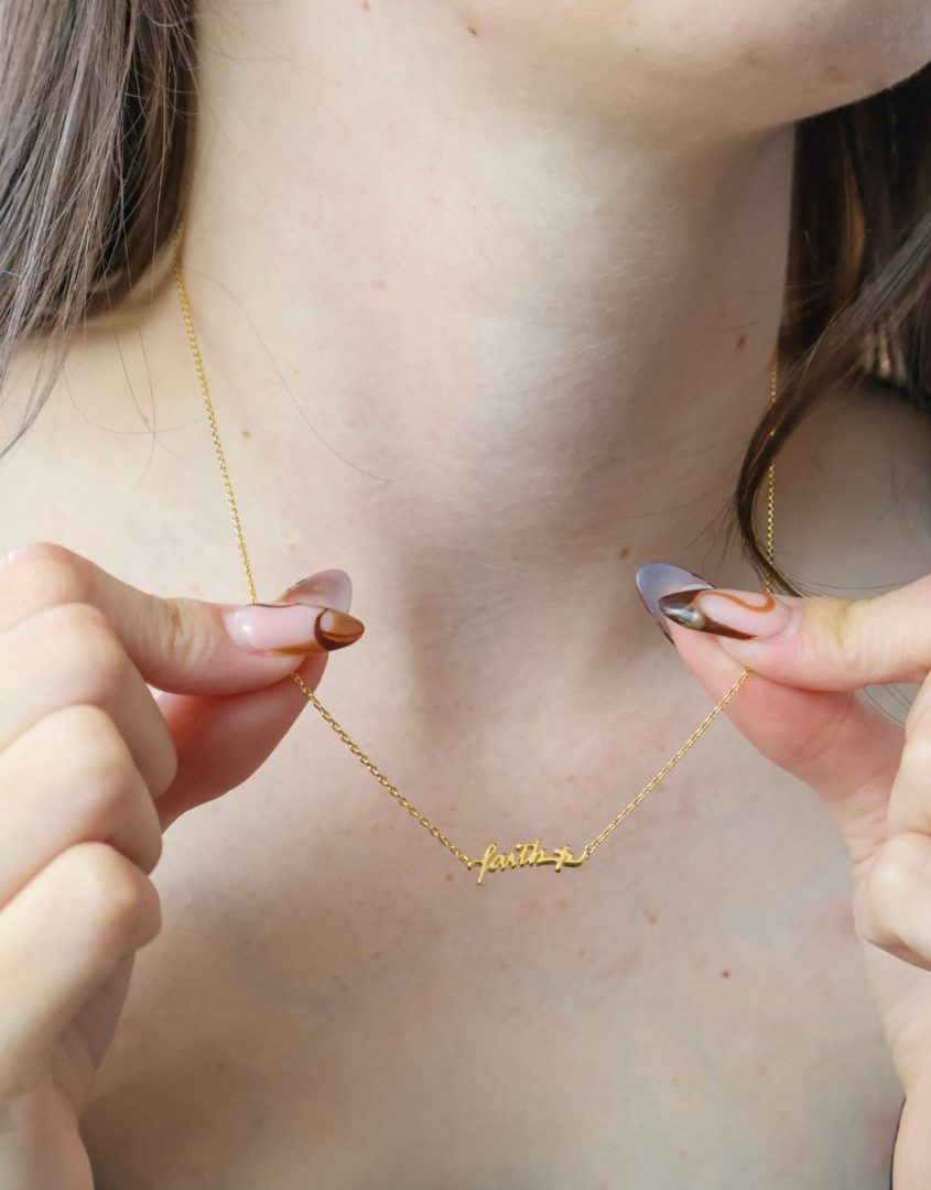 Delicate and full of meaning, the Simply Faith Necklace is a beautiful reminder to hold on to what anchors your heart. Crafted in radiant white or yellow gold-filled metal, the graceful cursive faith flows into a tiny cross, symbolizing a faith that’s steady, simple, and strong.